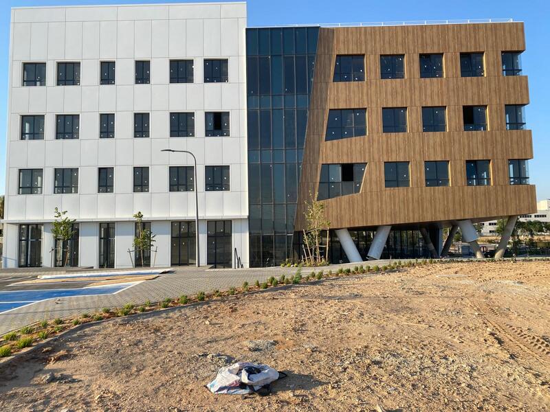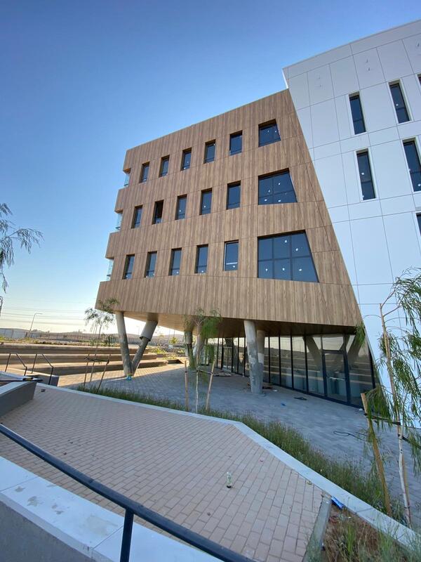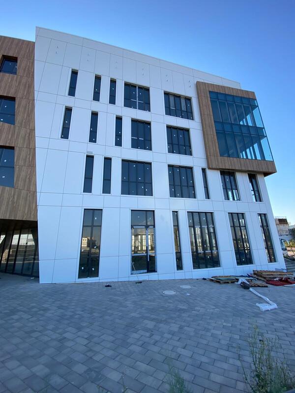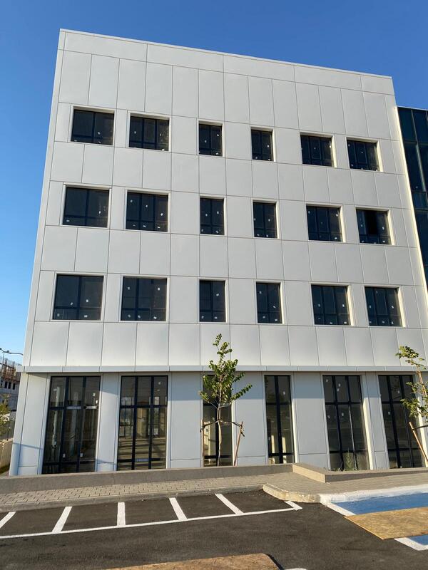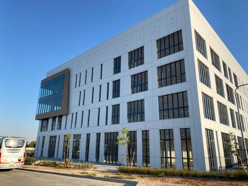 מבנה משרדים בעומר אשר ביצענו בו- קירות מסך מטריקס 50 לחצנים מרחף מקיר הבניין וקיר מסך סטרוקטורלי משולש , חיפויי אלומיניום 2 מ"מ , חיפוי HPL , חלונות מפרופילי 4750